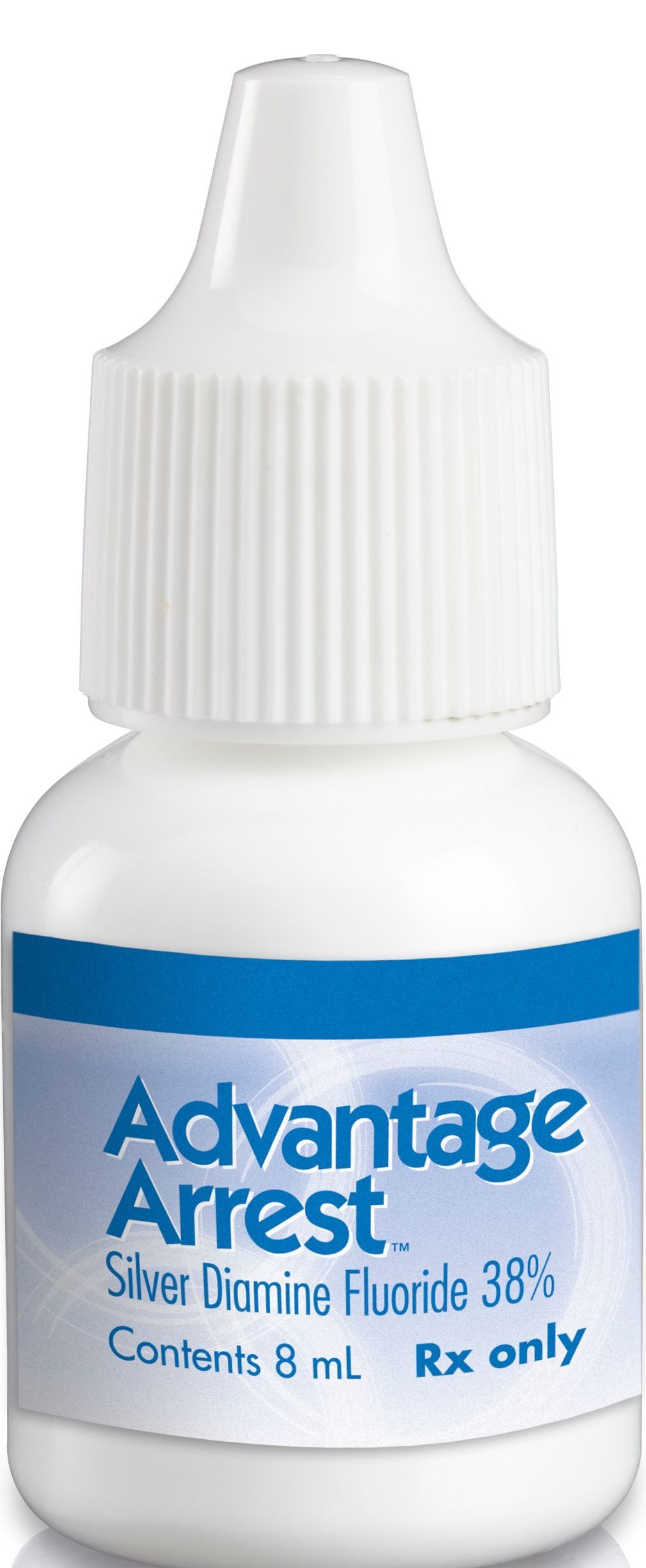 Elevate Oral Care, LLC, in West Palm Beach, Fla., makes the SDF solution available in the US called Advantage Arrest™. The one-step system is a blue topical agent that is tinted to improve placement visualization and comes in a small bottle with a brush.