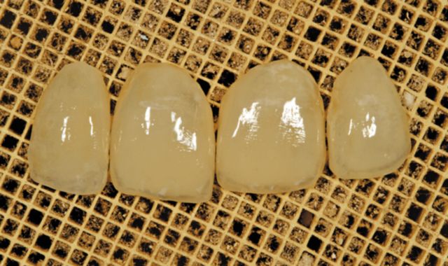 With minimum thickness allowed in the preparation of the teeth, a technician cannot apply specific enamel, translucency or mamelon amounts in order to achieve a match with the patient’s natural color. No more than two porcelain layers of color will work with a preparation thickness of only 0.1 to 0.3 mm, which leads to a final appearance that tends to be monochromatic in appearance, in the author’s opinion.