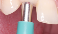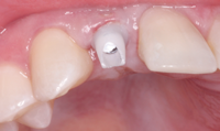 Fig. 19 The custom abutment fit perfectly, establishing margins just below the soft tissue. Teflon tape was placed over the fixation screw.
