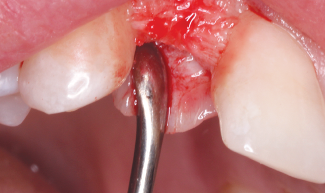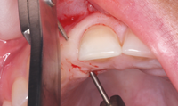 The patient agreed to the treatment plan and returned for the implant placement appointment. After anesthetizing the area of treatment, an envelope flap was reflected just palatal to the crestal ridge so the bone volume and osteotomy trajectory could be visualized.