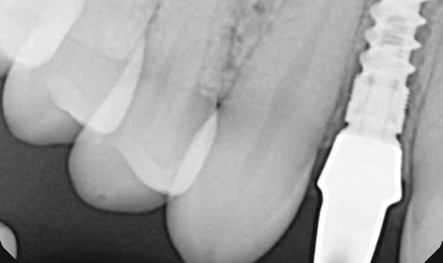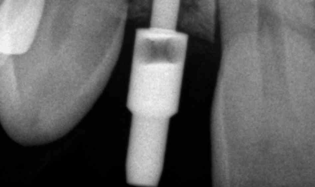Fig. 18 Complete seating of the custom abutment was confirmed with a periapical X-ray.