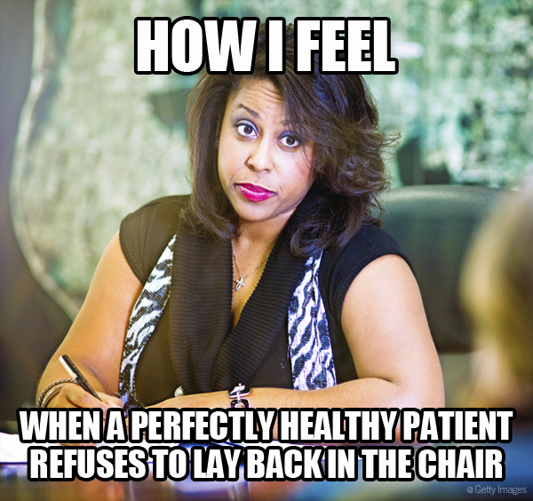 Of course there are valid health reasons a patient can’t lay supine. However, if you don’t sleep sitting up, you most likely can lay back for your dental appointment. The best treatment is given when we can SEE.