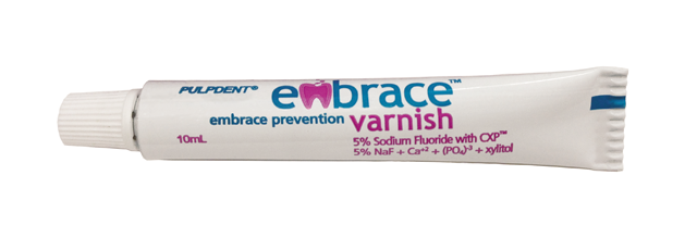 Pulpdent Corporation’s Embrace Varnish, 5 percent sodium fluoride with CXP, is now available in economical 12 mL tubes. By incorporating xylitol-coated calcium and phosphate in a permeable resin matrix that does not separate and requires no mixing, Pulpdent developed a sustained, time-release bioactive varnish with predictable, uniform dosage that reportedly delivers 10 times more fluoride than the leading varnish brand in four hours. The xylitol coating prevents the calcium and phosphate salts from reacting until they come in contact with saliva. Then the calcium and phosphate ions react continuously in saliva with fluoride ions to form protective fluorapatite on the teeth that fills superficial, noncarious enamel lesions (white spots).