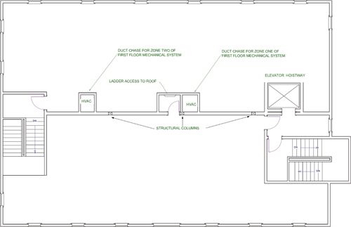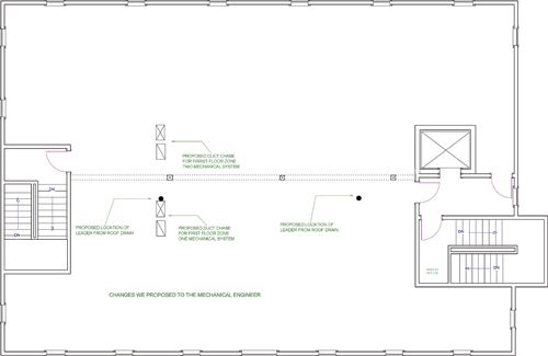 We first approached the architects and expressed the benefits of relocating the roof-access ladder to the stairwell. They were receptive and agreed to that change. We then met with the mechanical engineer and proposed the noted changes in duct chase locations: