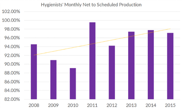 Trends indicate that starting in 2011, practices and hygienists have become more efficient at managing this ratio. This may be because hygienists and practices are using optimization tools to track key metrics on patient no shows, production and other important practice data. Knowledge about how the practice is performing, over time and compared to national benchmarks allow for practices to address concerns and make changes that facilitate growth and market competitiveness.
