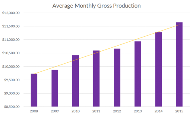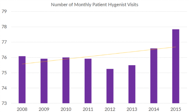 Hygienists have played an increasingly important role in bringing in revenue to the practice. In 2008, they brought in a monthly average of $9,728.73, and by the end of 2015 they were bringing in $11,648.43. This is an 19.7 percent increase in revenue over the previous eight years. Possible reasons for this change include increases in dental fees, reflecting the rising cost of performing business, as well as increases demand for hygienist services.