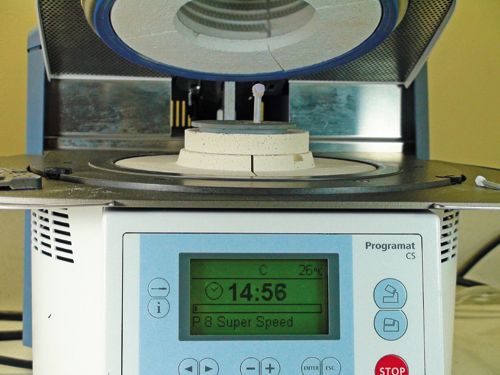 7) The full-coverage crown restoration was milled using an in-office milling unit, after which it was tried in the mouth to verify fit. The monolithic restoration was then removed from the mouth, at which time it was characterized using glaze and universal stains (IPS Empress Universal Stains, Ivoclar Vivadent), then fired in a fast cycle (Programat CS Furnace, Ivoclar Vivadent).