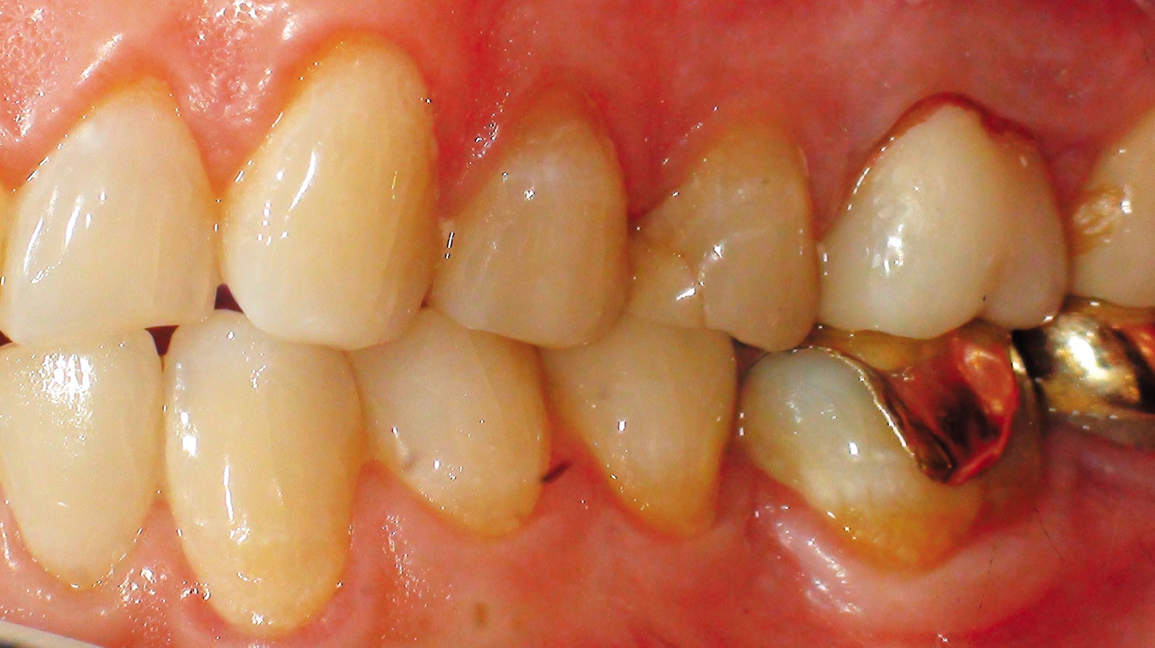 15) The now gel-like excess cement was removed using a scaler, and the restoration received a final full cure from all angles for 10 seconds each using an LED curing light (Bluephase Style). The occlusion was checked and adjusted as needed, and the restoration was polished.