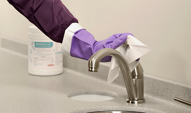 PPE for cleaning environmental surfaces may include gloves, masks, gowns and eye protection. Utility gloves may be recommended as they’re more chemical- and puncture-resistant than examination gloves. The correct type of PPE depends on the infectious or chemical agent and the anticipated type of exposure.1 The safety data sheets and manufacturer’s instructions of products used will indicate which PPE will be required when using the product.