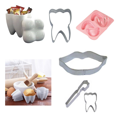 For those who love to bake! Make a gift basket out of a tooth-shaped cookie jar and fill it with dental-shaped cookie cutters shaped like a tooth and toothbrush or a pair of lips, a cupcake mold, and an ice tray.Â