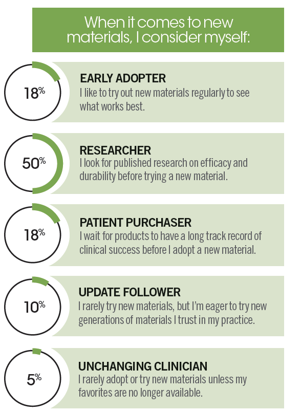 Even when a material is new, dentists still prefer something with a track record. This is demonstrated by the fact that half of the 2021 Material Survey respondents said they want to see published research on new materials before bringing them into the operatory. This was up from the 37% who said the same thing last year. The second most popular choice was a tie between the early adopters and the wait-and-see crowd.