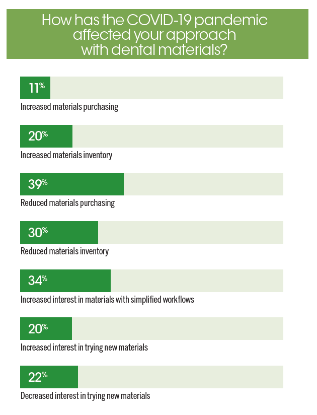 This past year was especially hard on dental practices, and COVID-19’s impact affected the ways materials were purchased and managed. Many practices were conservative and reduced purchasing and inventory, but a fifth of respondents said they increased inventory, possibly to ward off the impact of supply chain issues.