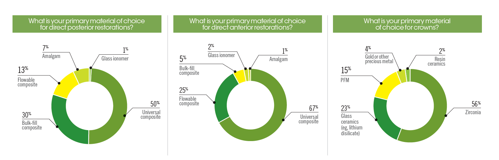 Material preferences remained fairly stable year over year. The most popular choice for crowns and composites in both the posterior and anterior remained the same this year, but there were a few notable shifts. Universal composites continue to earn their title, but flowable composites grew more popular in both areas of the mouth, with twice as many survey respondents in 2021 saying they prefer a flowable in the anterior compared with 2020. When it comes to crowns, zirconia remains the top choice of more than half the respondents.