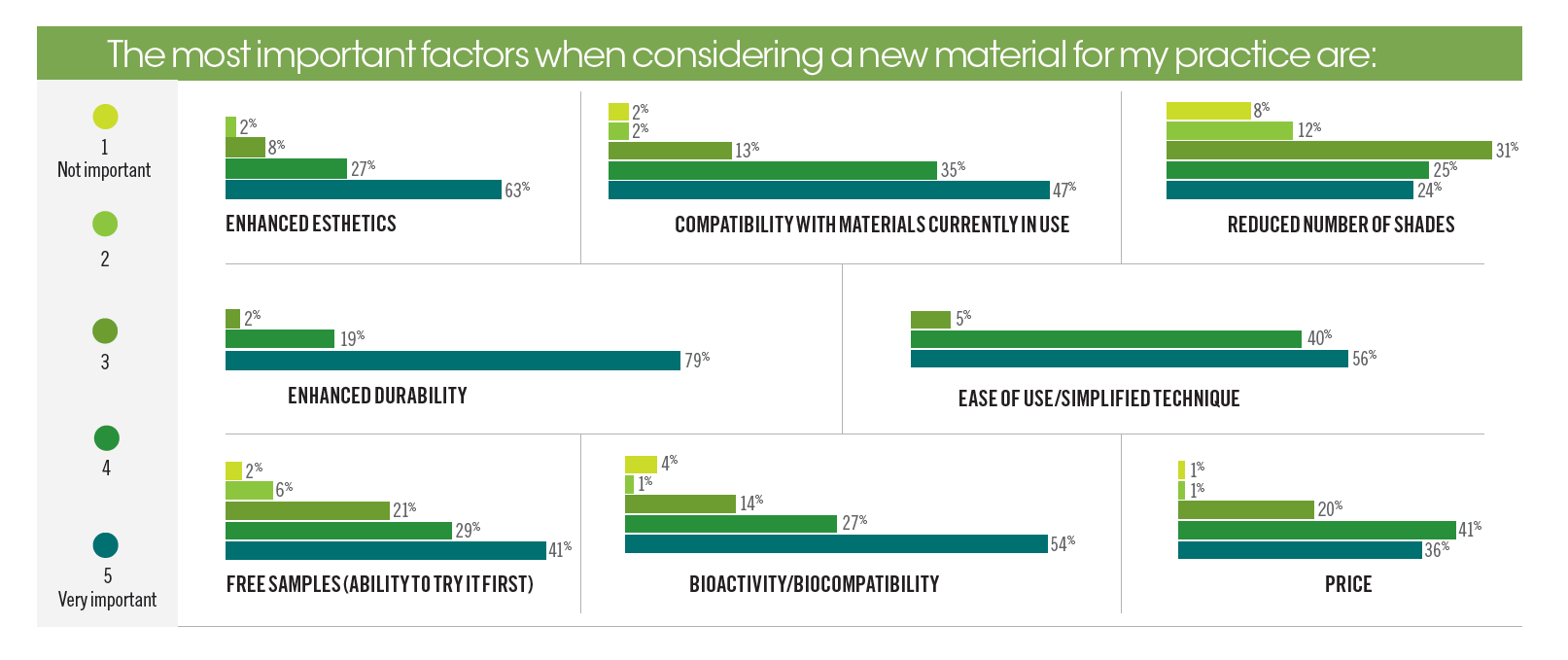 Close to 80% of respondents said enhanced durability is an important factor they look for when considering a new dental material, and this number is almost identical to the result of last year’s Materials Survey. However, it seems that esthetics grew in importance over the past year, as almost 10% more respondents said improving a material’s esthetics is very important. Another key factor that can make adopting a new material worth it is ease of use, which 97% of respondents ranked as important or very important.