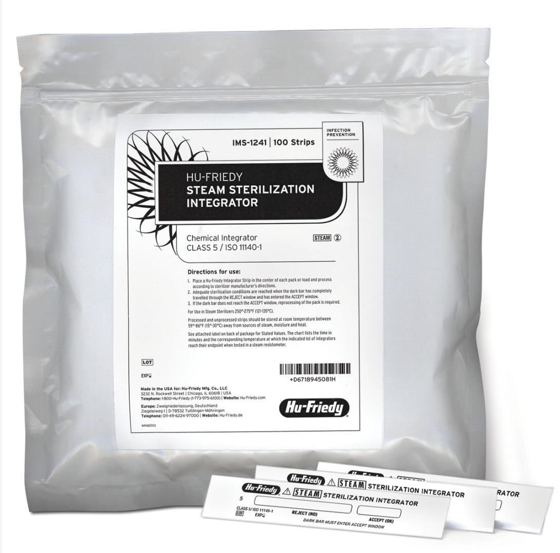 In contrast to other chemical indicators which can-at best-monitor two sterilization variables, Type V integrator strips contain a steam sensitive material that reacts with all three criteria for proper steam sterilization (i.e. temperature, pressure, time). During the sterilization cycle, the material moves across the wick- ing strip and only registers ACCEPT when the three sterilization conditions are met. Using a test strip in the center of each sterilizer load can serve as an important and early monitoring tool in between required spore testing intervals.