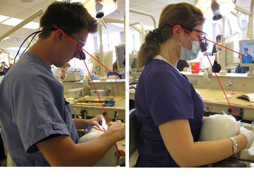 The worst head postures I repeatedly measure are on dentists using long barrel (high magnification) scopes mounted in through-the-lens frames (Figure 2, left). It is extremely difficult for manufacturers to achieve even a fair degree of declination angle with this combination. Furthermore, the heavy weight of the long barrel exponentially increases the forces on the cervical spine when combined with poor declination angle - a potent combination for neck pain and dysfunction. From a purely ergonomic standpoint, long barrel scopes are best mounted in a flip-up style loupe (Figure 2, right).