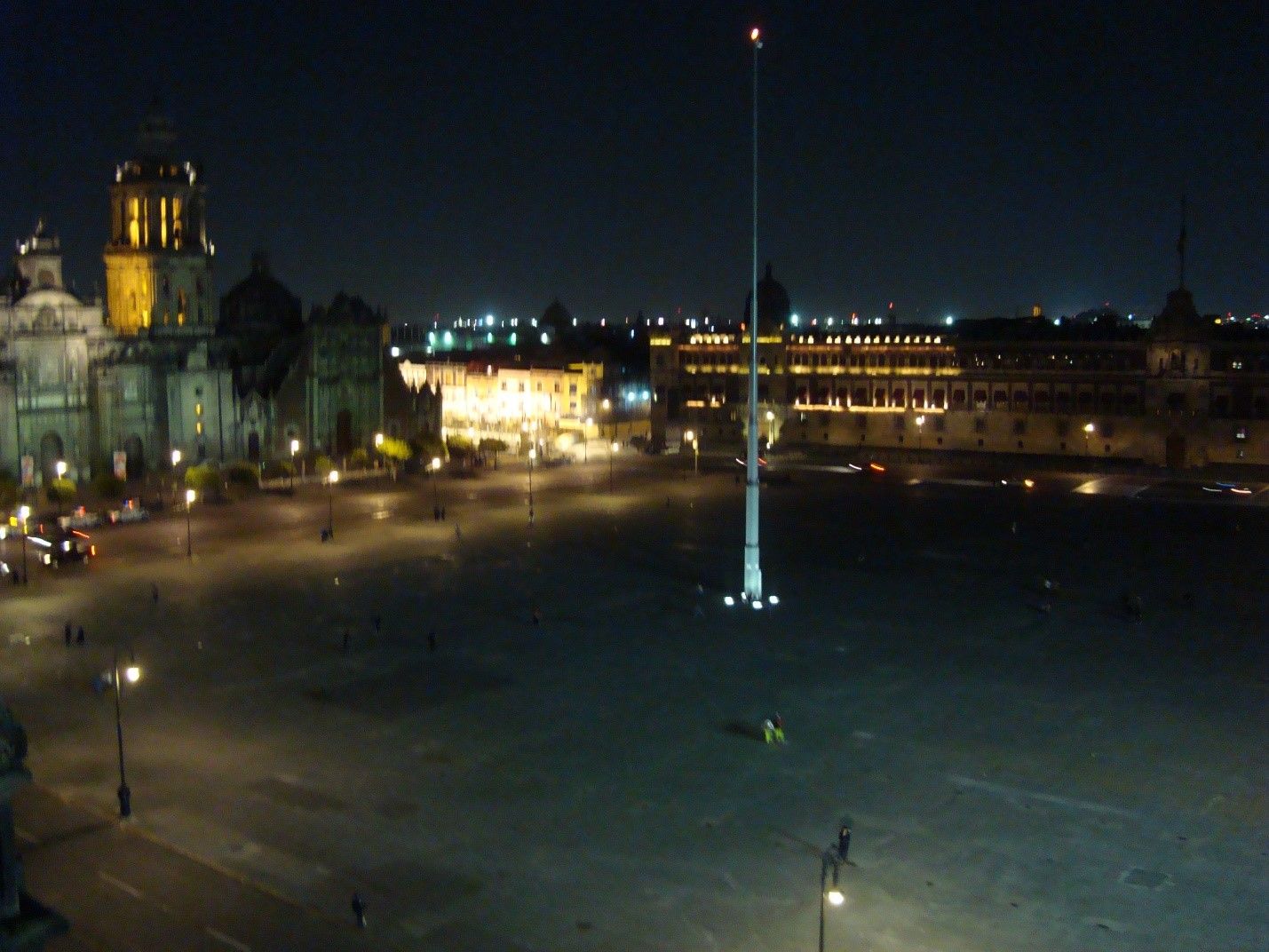 View from the Gran Hotel rooftop restaurant in Mexico City over the Zocolo at night.