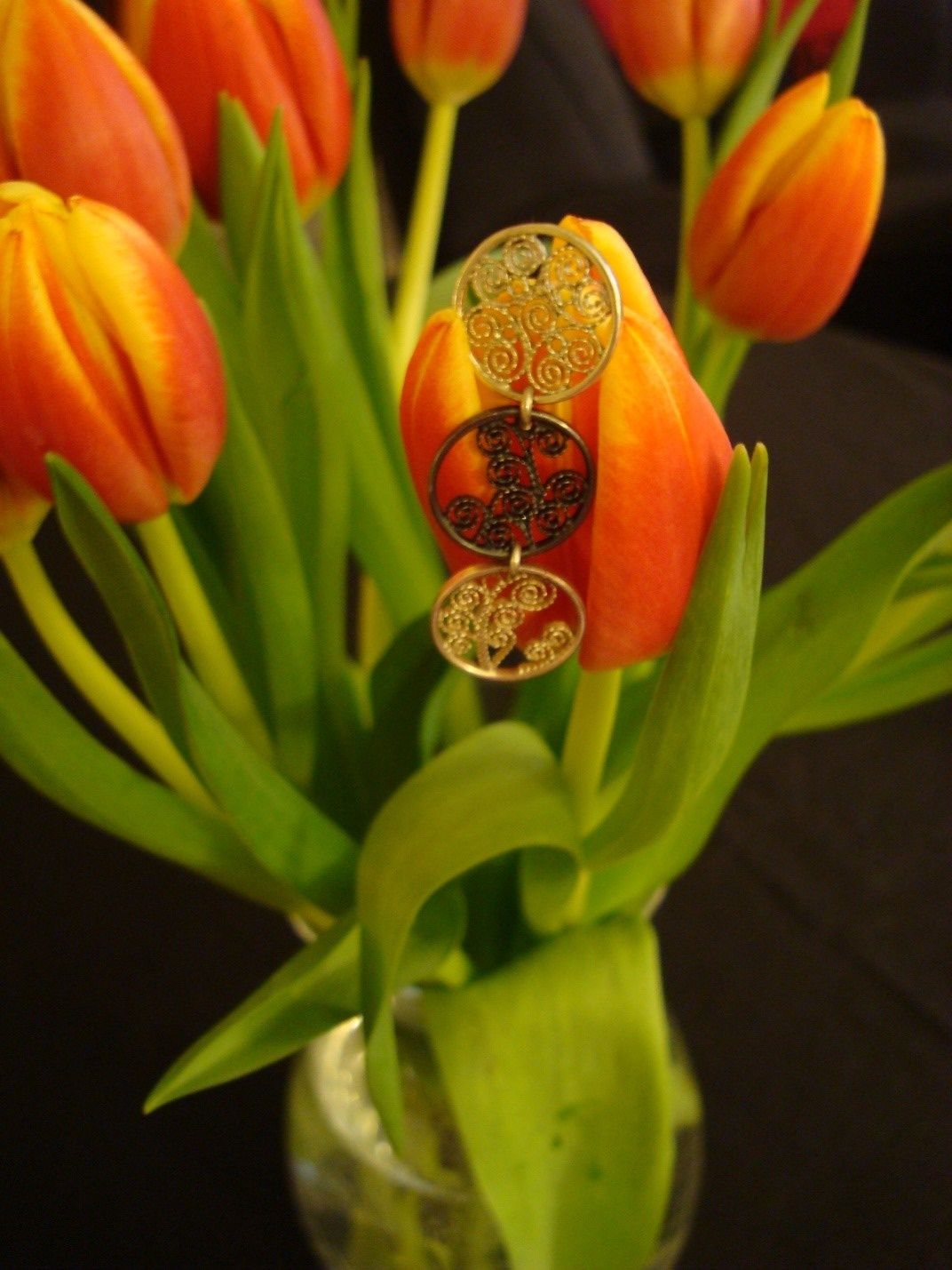 One of the two silver earrings (shown against a tulip bulb) I purchased from the gift shop of the Olga Y Rufino Tamayo, a modern art museum near the Archeological Museum in Mexico City. They cost about $118. Notice the contrast of the tarnished silver piece in the middle between the two silver roundels on either side. The mate to this earring is the reverse: tarnished silver, silver and tarnished silver rather than silver, tarnished silver and silver. This makes the earring pair interesting as well as attractive. Photo by the author.