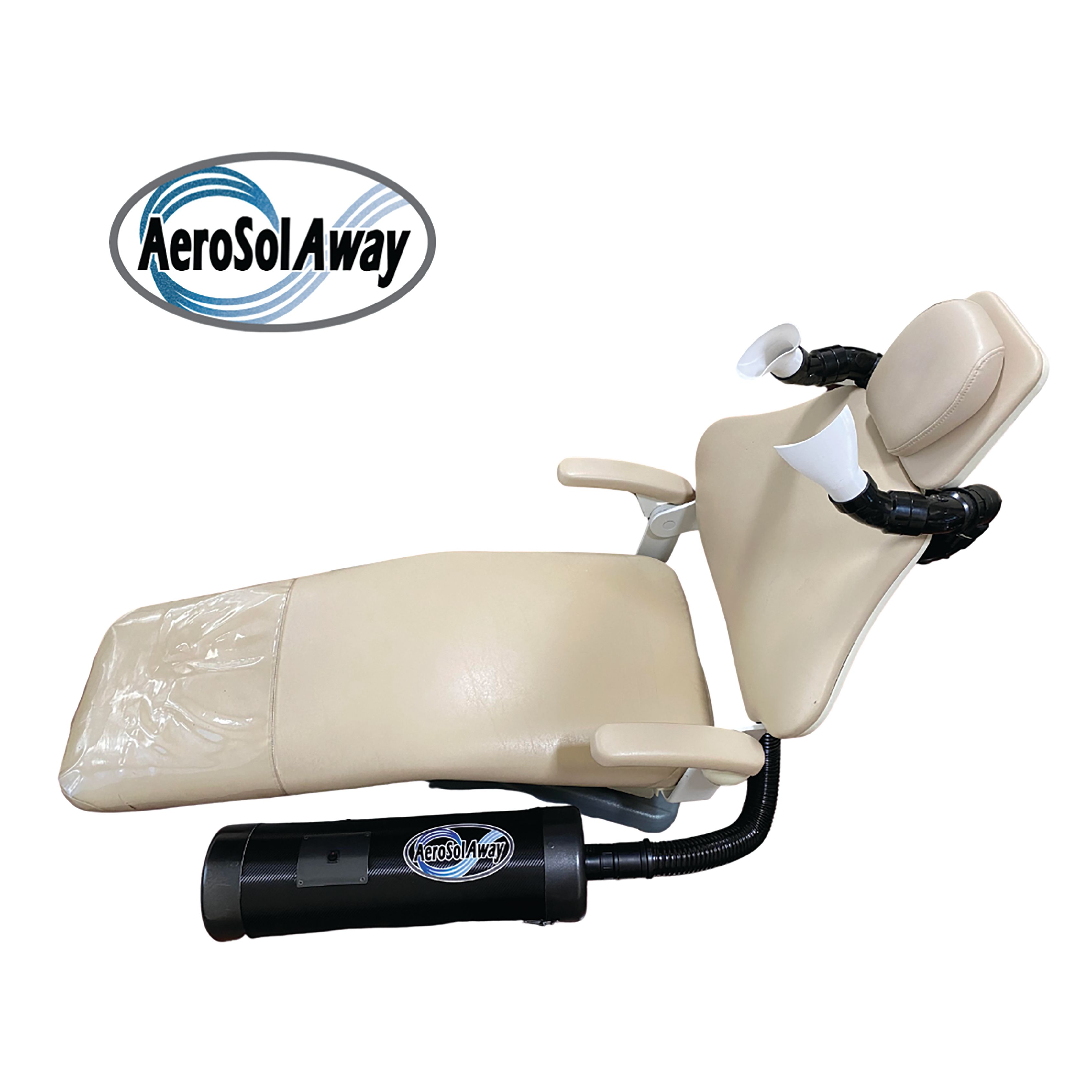 AeroSol Away’s stand-alone, dual-suction, negative-pressure system is mounted behind the operatory chair and designed to significantly reduce aerosols, splatter, and droplets generated during patient treatment.