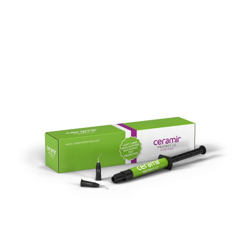 Ceramir Protect LC Syringe is a light-cured, resin-modified bioceramic pulp protectant for direct and indirect pulp capping. It is tolerant to moisture, insoluble, and radiopaque. With its thixotropic behavior and supplied needle tips, it can be applied precisely and evenly, even in deep-cavity preparations.