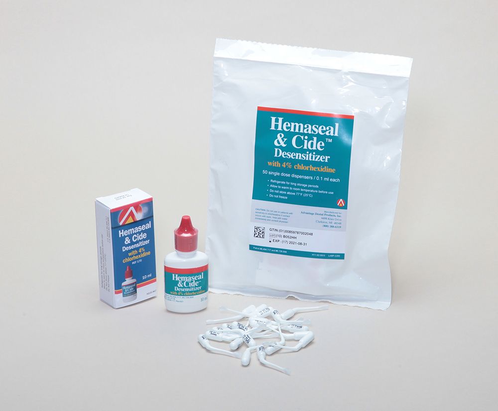 The material is free of glutaraldehyde, and an independent testing laboratory report indicates Hemaseal & Cide Desensitizer showed twice the antimicrobial activity of 2 popular glutaraldehyde-based desensitizers. Additionally, it is lower priced and cannot burn the free gingiva/soft tissue, like glutaraldehydes. It is available in bulk bottles and unit dose.