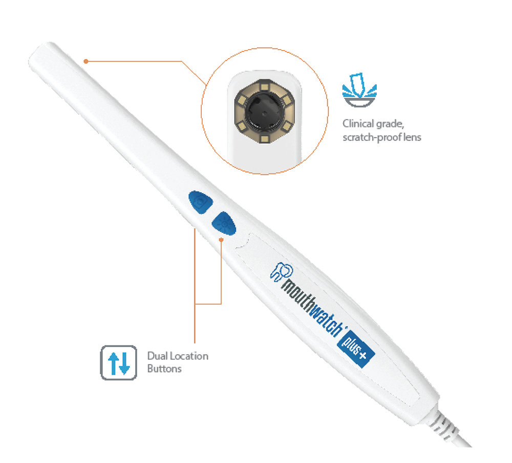 *The How: Every MouthWatch Plus+ purchase includes the MouthWatch Plus+ Intraoral Camera, integrated USB 3.0 connectivity with attached cable; 100 OptiClear™ intraoral camera sleeves, an extended 2-year warranty, complimentary lifetime technical support; plug and play 5-minute integration, live agent support if needed, camera button-capture software, and training and best practices resources. The camera features a high scan rate (60 fps) that delivers clear video and 2-megapixel images—even if the patient moves slightly. When it comes to ease of use, the camera includes 4-level adjustable LED lighting to match illumination to specific clinical needs. What’s more, dual buttons on the top and bottom of the camera for lighting and capture control offer multiple, ergonomic grasp options.