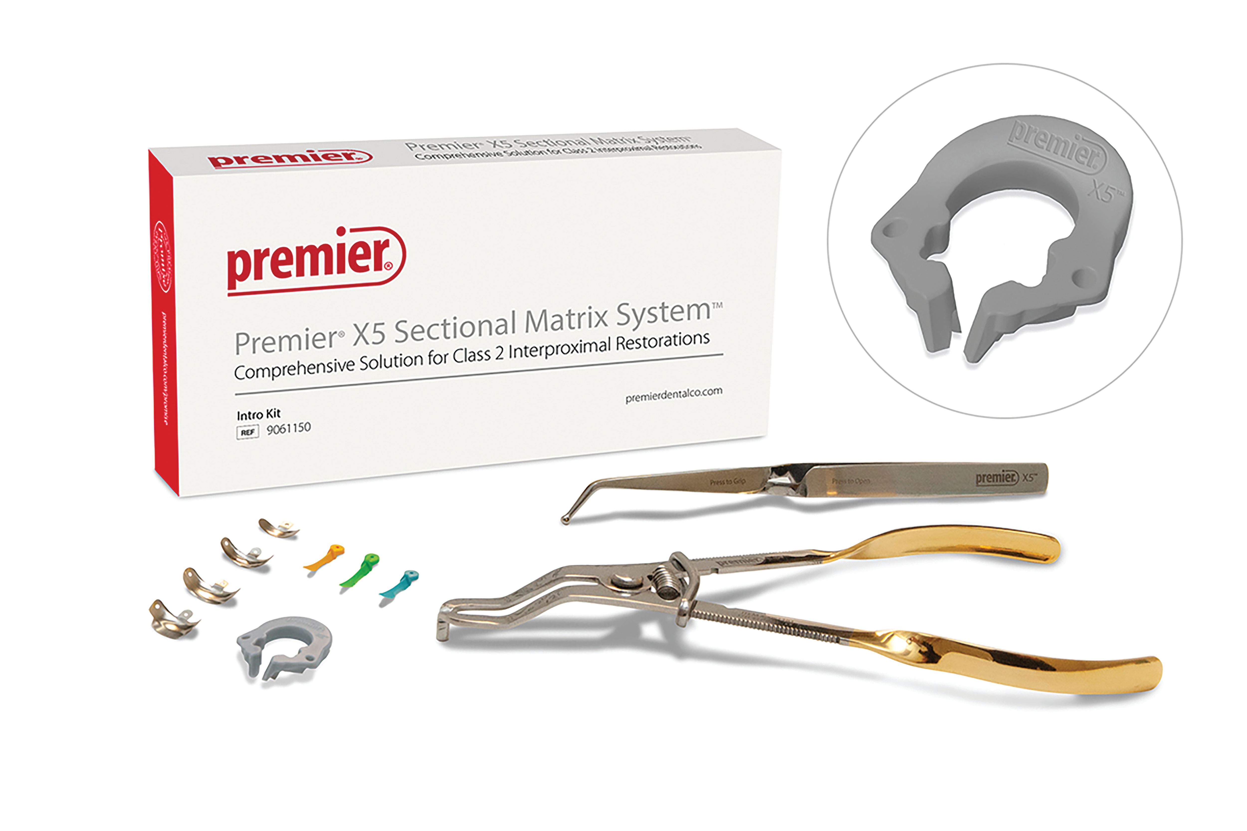 The Premier X5 Sectional Matrix System features affordable, reusable proprietary resin rings (up to 5 autoclave cycles), and anatomically shaped matrices that allow for proper contouring. It is designed to deliver perfect, tight contacts every time and is said to be cost effective when switching from more expensive metal ring systems. It also is compatible with other systems’ wedges and matrices, and easy to use compared with Tofflemire retainers.