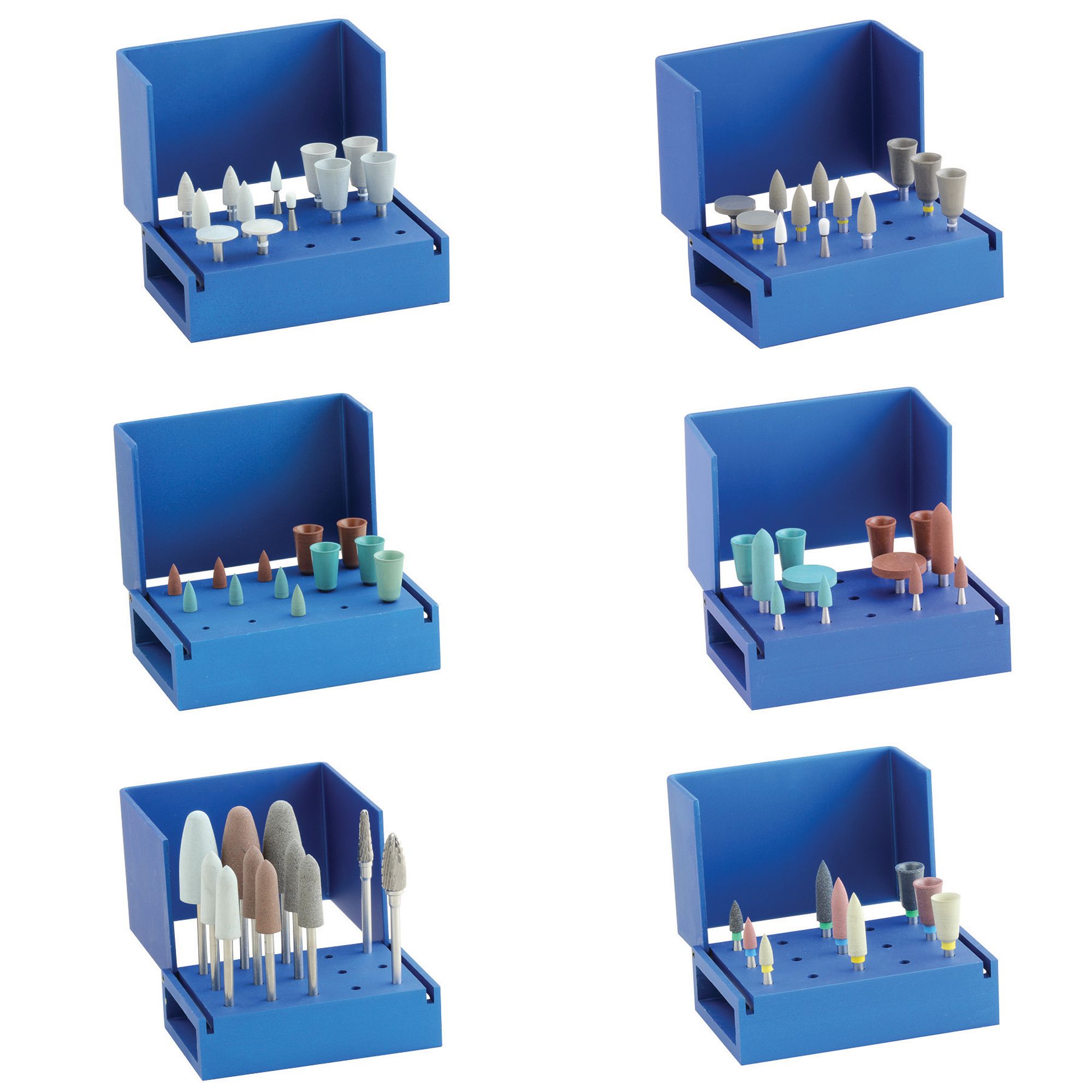 Each of the 6 kits is designed to provide proven quality at a superior value. They contain the perfect assortment of abrasives and polishers to guarantee predictable, esthetic results. This allows for stress-free selection of a polishing kit no matter what the material is.