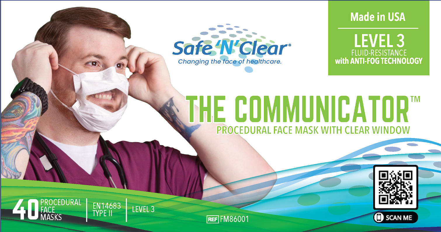 Available with either ASTM F2100 Level 1 or Level 3 protection, The Communicator™ is a surgical facemask with an integrated, fog-resistant clear window allowing the wearer’s mouth and facial expressions to be clearly seen. The disposable masks are designed for comfort and breathability without compromising protection from the spread of microorganisms and other particulate.