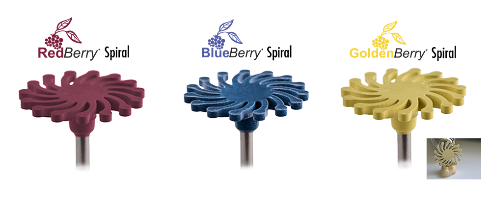 The Wagner diamond infused spiral provides a flexing action that allows the instrument’s fingers to get into difficult occlusal areas. With UltraBerry (coarse plus), RedBerry (coarse), BlueBerry (medium), and GoldenBerry (fine, high shine) instruments, lab technicians and clinicians can make final adjustments, refine occlusal anatomy, and create a high shine polish. They contour and shape aggressively yet leave a smooth finish.