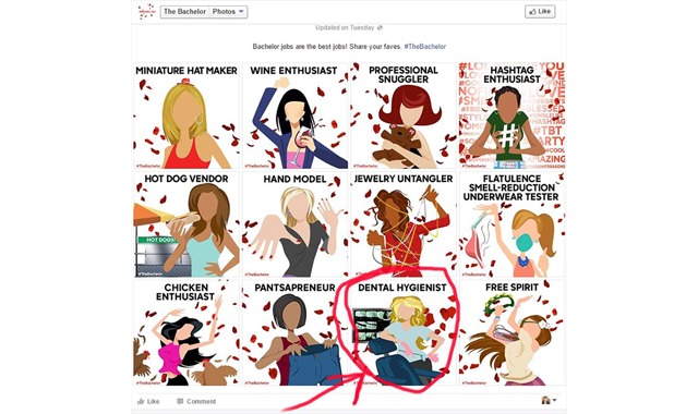 To get you up to speed, if you haven’t already heard, on January 26, ABC’s The Bachelor posted on their Facebook page a compilation of 12 pictures depicting ridiculous and fake jobs that contestants have put on their applications over the years. Dental hygienist was included, among others like hashtag enthusiast, flatulence smell-reduction underwear tester, jewelry untangler, etc. You can see the post for yourself here. While the title of the pictures currently says, “Bachelor jobs are the best jobs!” please realize that this wasn’t the original title. It was edited. It originally said something to the effect of, “12 funniest and ridiculous job descriptions…”