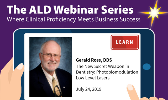The ALD CE webinar series will begin on July 24 from 7-8 pm EDT with “Dentistry’s New Secret Weapon: Photobiomodulation - Low Level Lasers.” This session will demonstrate how the power of low-level lasers can be used to heal tissue quickly and reduce pain without the use of opioids. The underlying science, proper dosage, and revenue-building benefits will be also be discussed.