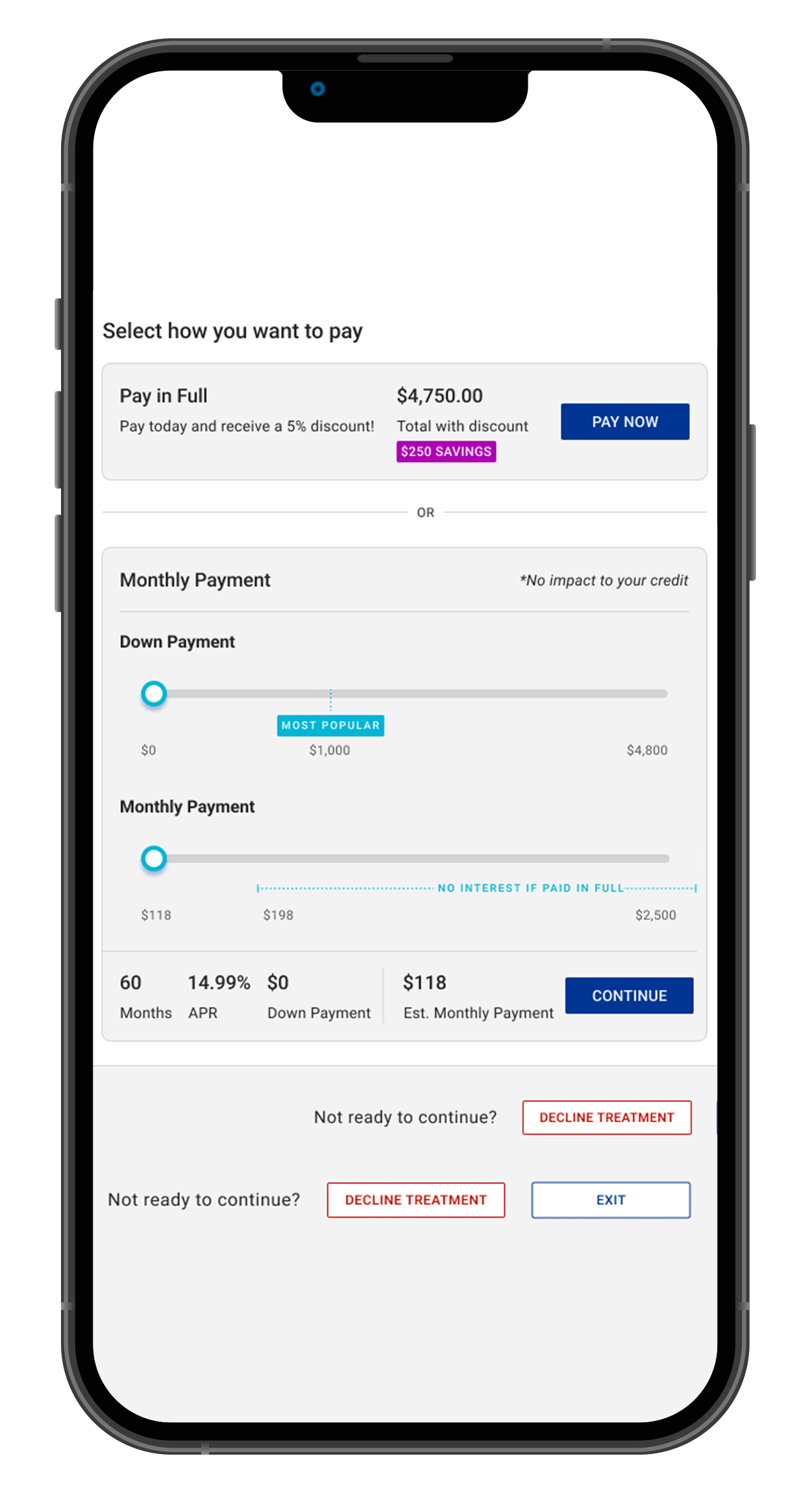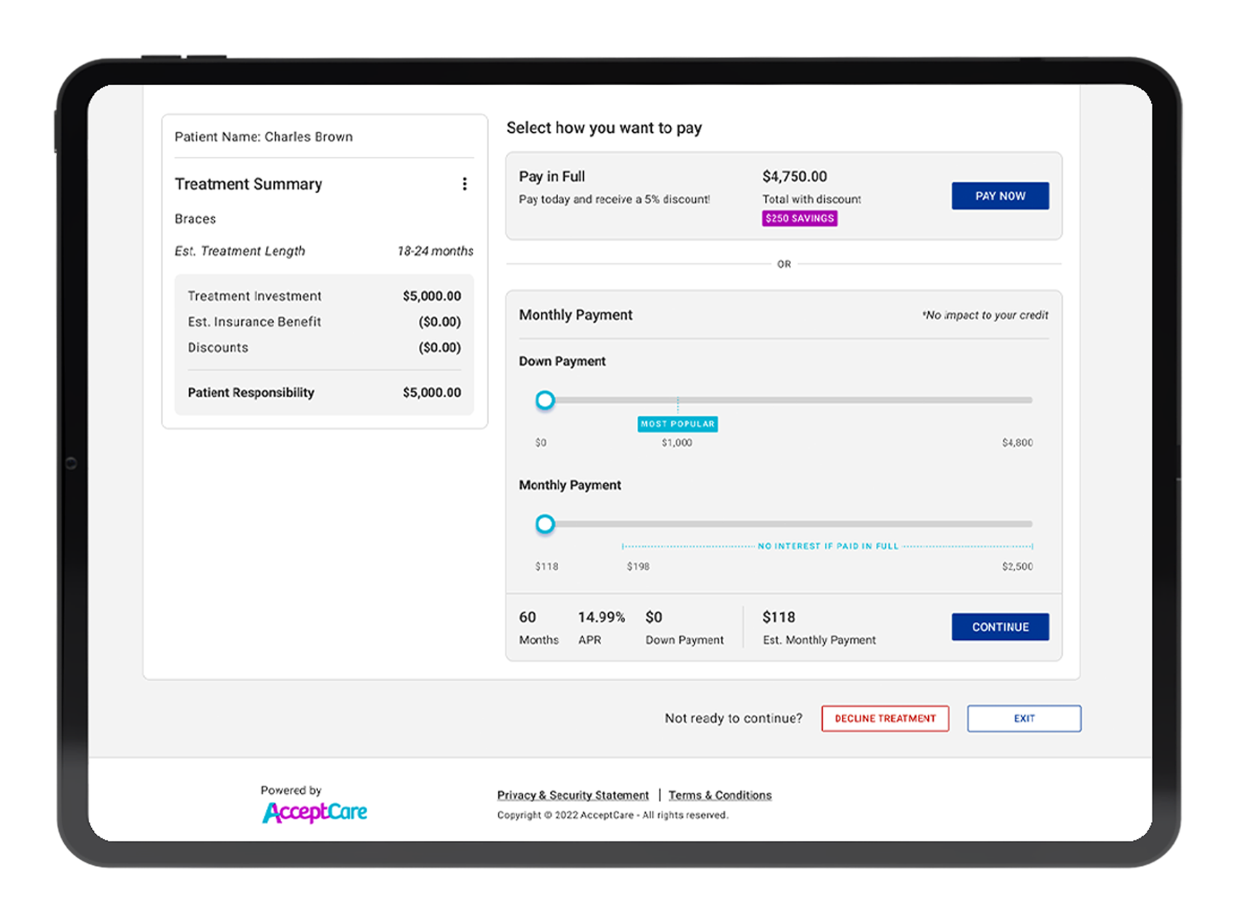 AcceptCare reports that over 30% of patients choose a monthly option for treatments less than $1,000. Additionally, with AcceptCare, 50% of treatment is accepted vs. 35% in offices without AcceptCare.