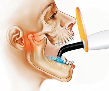 Form and footprint. The flat or toothbrush design of the VALO is a real advantage for the clinician and the patient. We have all experienced restoring the tough to reach the molar of a patient with a limited opening where the combination of the angle and length of the light guide, the pistol style design and the opposing arch of teeth dramatically limit light delivery to the object tooth (Fig. 1). Even a distant 3rd molar or deep cervical aspect of any tooth is easily reached with the VALO.
