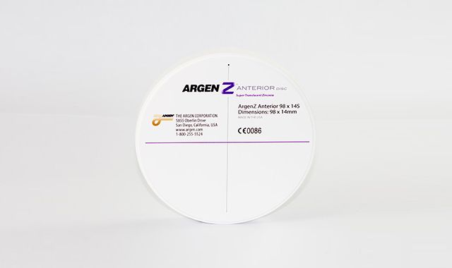 The Argen Corporation now offers ArgenZ Anterior Super Translucent Zirconia in disc form. ArgenZ Anterior discs are made in the USA and are available in 98 mm in a full range of thicknesses to fit most mills with 95mm and 100mm coming soon.