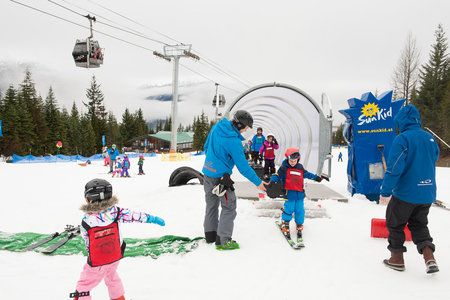 Whistler Blackcomb offers private ski and snowboard lessons for families with kids as young as 2.5 years. The Snow School has group ski lessons for ages 3 to 4, 5 to 6, and 7 to 12, as well as snowboarding classes for ages 4 to 6 and 7 to 12. Slow-skiing family zones make practice fun and grommets will appreciate the not-too-difficult features and family-certified snowboarding routes at the Nintendo Big Easy Terrain Park.