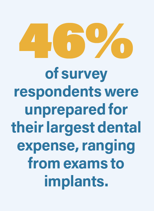 There are a lot of good surprises, like finding a $20 bill in an old coat pocket. Then there are surprises that are not as welcome, like unexpected dentistry. Synchrony, on behalf of CareCredit, conducted the Dental Lifetime of Care study in 2023 to understand individuals’ perceptions of the cost of dentistry and gain insights on how that perception may shape their dental health care decisions.1 One of the key findings was that 46% of survey respondents were unprepared for their largest dental expense, ranging from exams to implants. Utilizing the survey results, dental practices can help more patients move forward with needed or wanted dentistry by being prepared when their patients are not.