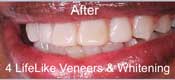 In this patient’s case I simply placed four LifeLike Veneers™ in combination with in-office whitening and voila, like David Copperfield, we magically transformed her smile-and her self-esteem-in one stress-free visit.