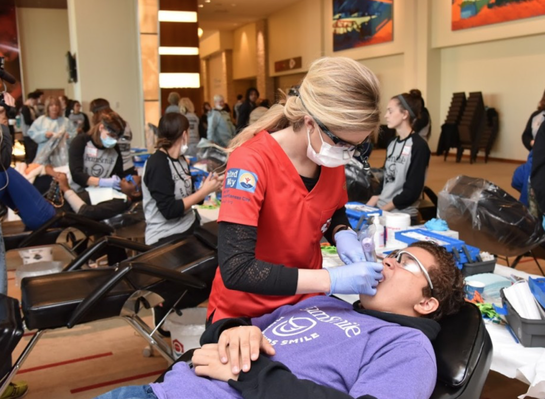 TeamSmile sets up 16 hygiene stations and 12 dental operatories at each function.