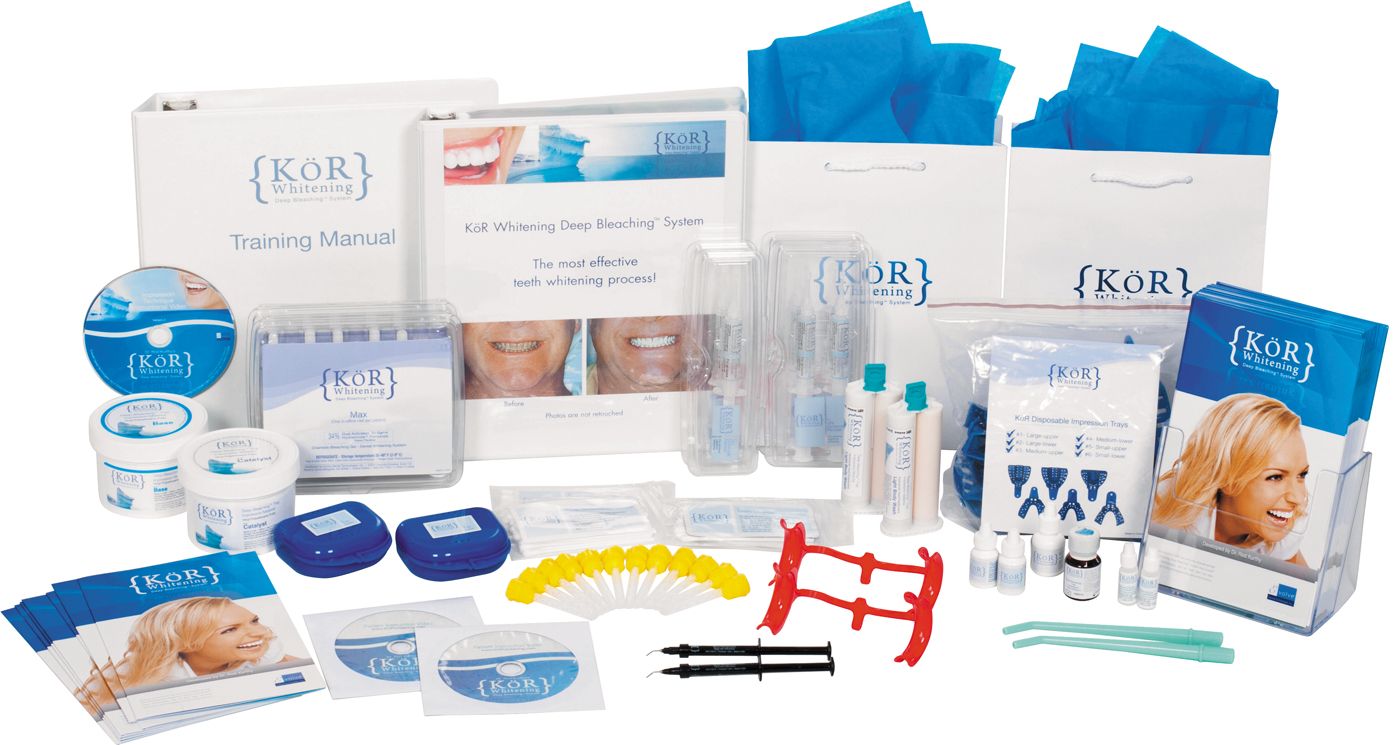 The KöR Whitening Deep Bleaching System is designed to ensure optimal whitening gel performance and effectiveness, and is available in a range of kits including a standard kit, a MAX kit and an ULTRA kit. All three kits feature 2 weeks of at-home whitening immediately followed by one in-office treatment. The MAX kit requires an in-office treatment prior to the at-home use. At-home only whitening kits also are available.