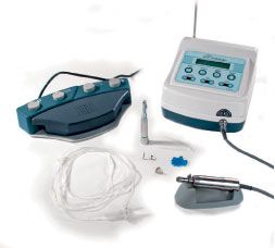 Compatible with all brands and all types of implants, this motor system is operated via a full-function, variable speed foot pedal. The 50,000 rpm high-torque handpiece features a 32:1 push button contra angle. The control box can save settings for angle reduction, speed, torque, rotating direction and irrigation pump flow for up to 10 memory settings. The easy-to-use and install on-board irrigation pump for sterile water or saline provides consistent and predictable on demand water flow.