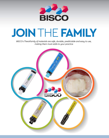 BISCO’s proprietary THERA technology is available in: TheraCem, a MDP containing self-adhesive resin cement; TheraCal LC, a pulp-cap and liner material; TheraCal PT, indicated for pulpotomies; and TheraBase, a MDP containing base and liner material.