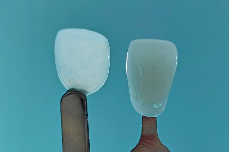 An UltraThineer, (left) compared with a standard zirconia veneer, (right). | Credit: © Boston Micro Fabrication