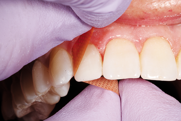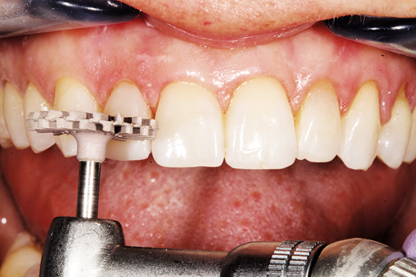 Interproximal polishing was done with various grits of strips to aid in flossing and to decrease the risk of stain buildup in the future (Fig. 11). ALPEN® ShapeGuard™ Composite Plus Step 2 Polishers and a felt polishing disc with aluminum oxide paste created a natural high gloss finish for esthetics and longevity (Fig. 12).
