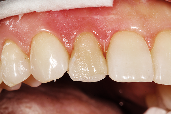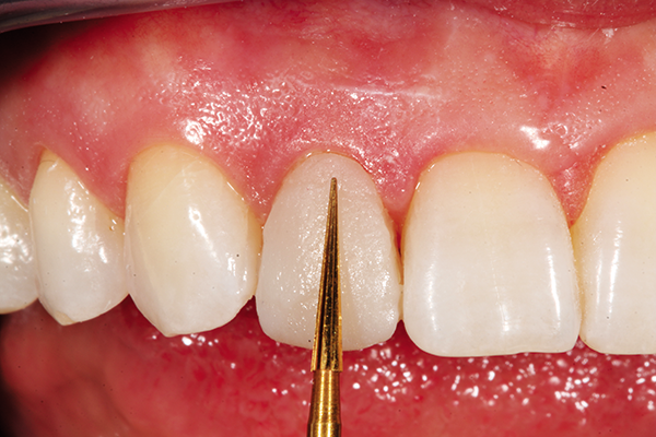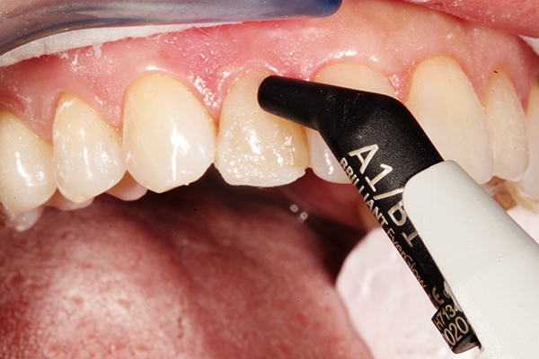 Tooth #7 was conservatively prepared to remove old composite buccally and interproximally. After microetching with aluminum oxide and rinsing with chlorhexidine, 37% phosphoric acid was applied and rinsed thoroughly with water and then lightly dried.