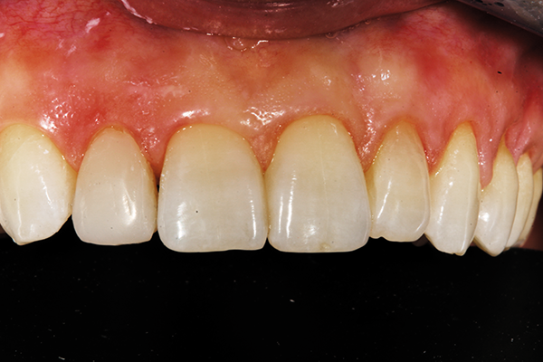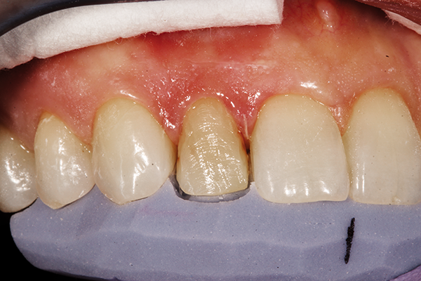 A patient with a very compromised cardiovascular condition wanted to conservatively improve her smile at tooth #7, where it was dark from retrusion and old compositematerial that was poorly shaped. To correct this matter, a strategy to whiten the surrounding teeth while a blueprint of an improved shape/volume was created on a model would be followed by gently reshaping line angles and doing a direct veneer on the challenging tooth (Fig. 6).