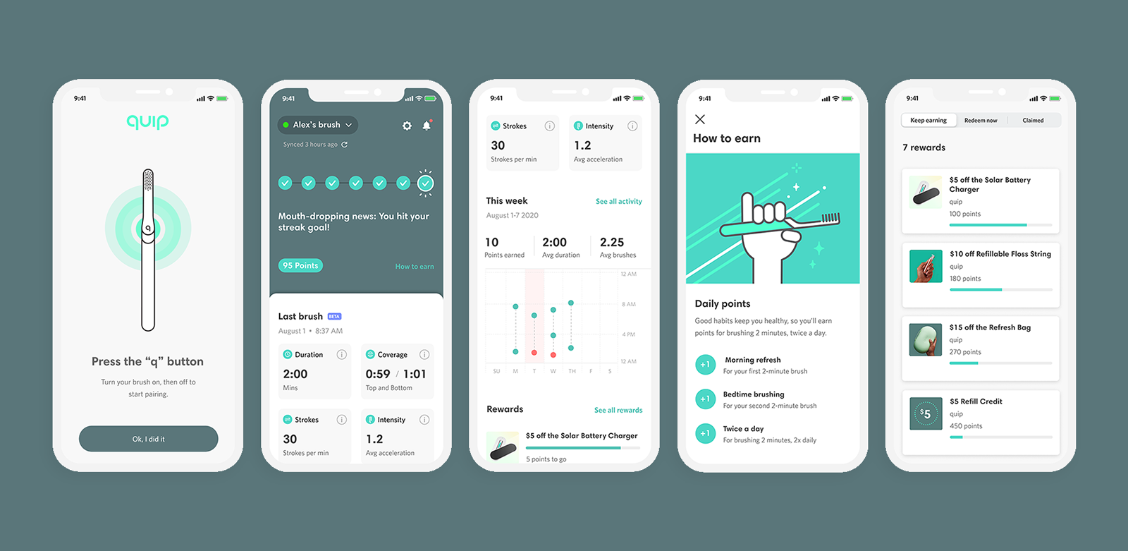 Brushing your teeth for 2 minutes, twice daily sounds simple... but it turns out the average American only brushes for 45-70 seconds ONCE per day – which is absolutely insane + kind of gross! quip knows that forming good habits (& changing bad ones) is hard – and that the key to making those habits stick is reminders, routine guidance, and reward. While quip’s OG electric toothbrush certainly checks those boxes, the Smart Brush is bringing them to life in a totally new way.