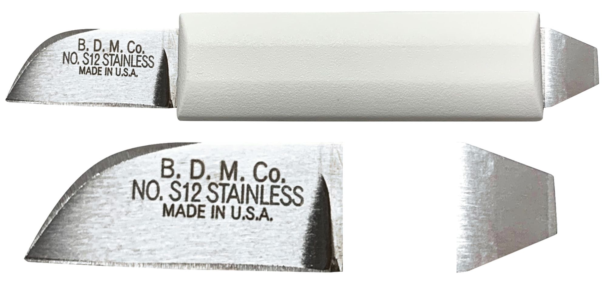 This knife is designed to be stain-resistant and touts a white, plastic handle. It is indicated for use in both dental practices and labs with a carbon steel composition and a double end.