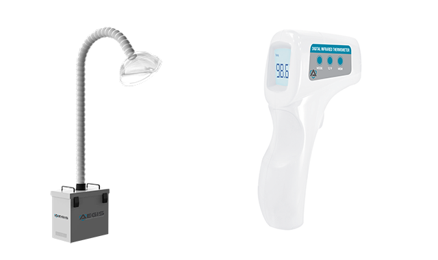 The Aegis PPE line consists of-but is not limited to-Aerosol VacStation, infrared thermometer, coverall suits, protective KN95 masks, surgical masks, protective goggles, and face shields. Each product has unique features to protect staff in dental settings.