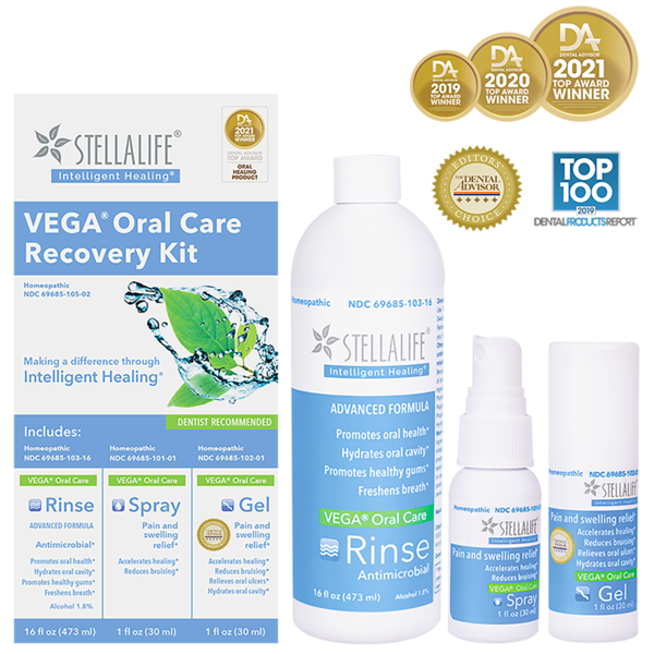 The natural Vega kit includes antimicrobial rinse, sublingual spray, and topical gel. It is indicated for a variety of uses, including all dental surgical procedures such as extractions, bone and tissue grafting, implant placement, and biopsies.
